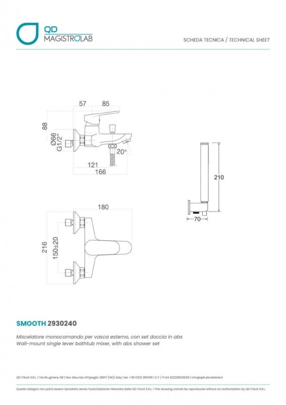 Настенный смеситель для ванны QD MagistroLab Smooth 2930240, однорычажный с душевым гарнитуром